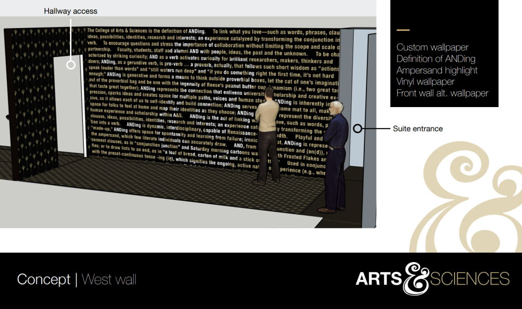 The A&S advancement team asked for help designing posters and wall art for the dean’s suite in Folsom Stadium. Kylie Clarke, Erika Randall and I explored attendees’ experiences to-date, and we found opportunity to develop a distinct atmosphere that encouraged mingling in one end of the suite and watching the game in the other.